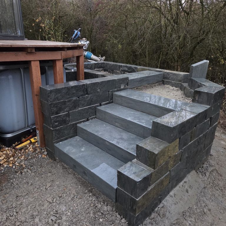 Im Bau befindlicher Treppenaufgang aus hochwertigem Anröchter Naturstein, der künftig einen eleganten und langlebigen Zugang zur höher gelegenen Gartenebene bildet.